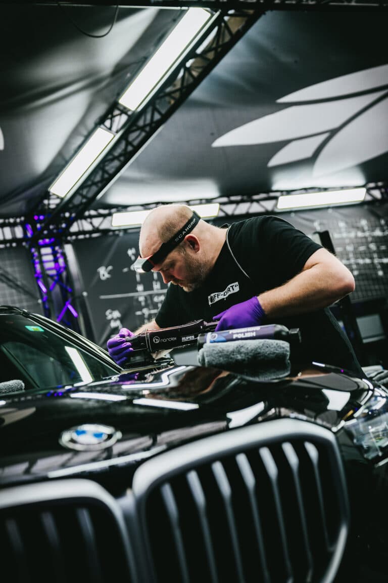 Führen Sie die Clay Bar mit leichtem Druck über die benetzte Oberfläche in geraden Linien. Das Gleitmittel ermöglicht ein reibungsloses Gleiten der Clay Bar und entfernt Verunreinigungen effektiv.